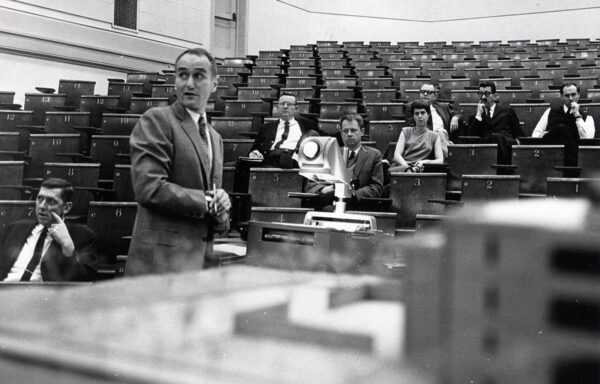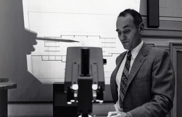 Thanks to Dean Dietz’s advocacy to permit faculty to have University architectural commissions, Dan was asked to take on the addition to Architecture Hall and collaborate with another firm on the project. Dan brought on Gene Zema and they began planning for what is now Gould Hall. Dan talked in detail about the planning, design, and construction of Gould Hall, noting that there was a request for “significant space, within the structure or immediately adjoining outside, to be used for special events, exhibitions, for temporary construction, etc.”